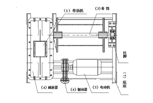 本結(jié)構(gòu)采用行星齒輪傳動(dòng)方式,通過(guò)聯(lián)軸器直接帶動(dòng)卷筒轉(zhuǎn)動(dòng),并可簡(jiǎn)易更換報(bào)廢鋼絲繩或改變鋼絲繩旋轉(zhuǎn)方向。制動(dòng)機(jī)構(gòu)